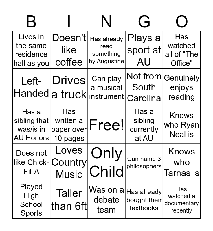This bingo card has a free space and 24 words: Loves Country Music, Taller than 6ft, Can play a musical instrument, Played High School Sports, Has watched all of "The Office", Lives in the same residence hall as you, Left-Handed, Doesn't like coffee, Has a sibling currently at AU, Only Child, Not from South Carolina, Has a sibling that was/is in AU Honors, Can name 3 philosophers, Knows who Tarnas is, Drives a truck, Has already bought their textbooks, Knows who Ryan Neal is, Has already read something by Augustine, Genuinely enjoys reading, Has written a paper over 10 pages, Has watched a documentary recently, Does not like Chick-Fil-A, Plays a sport at AU and Was on a debate team.
