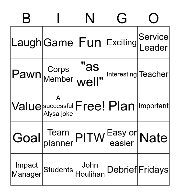 This bingo card has a free space and 34 words: Facilitator, Debrief, Introvert, Learning Style, Goal, Corps Member, Service Leader, Impact Manager, Game, Activity, "as well", Fun, Reflective, Understand, Plan, Teacher, Students, Value, Team planner, Easy or easier, PITW, Culture, Laugh, Important, John Houlihan, Fridays, Exciting, An IM's name, Interesting, Pawn, CYNH, A successful Alysa joke, Nate and "___ year".