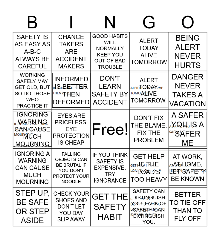 This bingo card has 7 images, a free space and 24 words: FALLING OBJECTS CAN BE BRUTAL IF YOU DON'T PROTECT YOUR NOODLE, CHECK YOUR SHOES AND DON'T LET YOU DAY SLIP AWAY, DON'T LEARN SAFETY BY ACCIDENT, STEP UP, BE SAFE OR STEP ASIDE, BEING ALERT NEVER HURTS, SAFETY IS AS EASY AS A-B-C ALWAYS BE CAREFUL, WORKING SAFELY MAY GET OLD, BUT SO DO THOSE WHO PRACTICE IT, CHANCE TAKERS ARE ACCIDENT MAKERS, DON'T FIX THE BLAME, FIX THE PROBLEM, IF YOU THINK SAFETY IS EXPENSIVE, TRY IGNORANCE, ALERT TODAY. ALIVE TOMORROW,, IGNORING WARNING CAN CAUSE MUCH MOURNING, GET HELP IF THE LOAD'S TOO HEAVY, AT WORK, AT HOME, LET SAFETY BE KNOWN, INFORMED IS BETTER THEN DEFORMED, SAFETY CAN DISTINGUISH YOU. LACK OF SAFETY CAN EXTINGUISH YOU., A SAFER YOU IS A SAFER ME, GOOD HABITS WILL NORMALLY KEEP YOU OUT OF BAD TROUBLE, DANGER NEVER TAKES A VACATION, EYES ARE PRICELESS, EYE PROTECTION IS CHEAP, BETTER TO TIE OFF THAN TO FLY OFF, IGNORING A WARNING CAN CAUSE MUCH MOURNING, ALERT TODAY ALIVE TOMORROW and GET THE SAFETY HABIT.