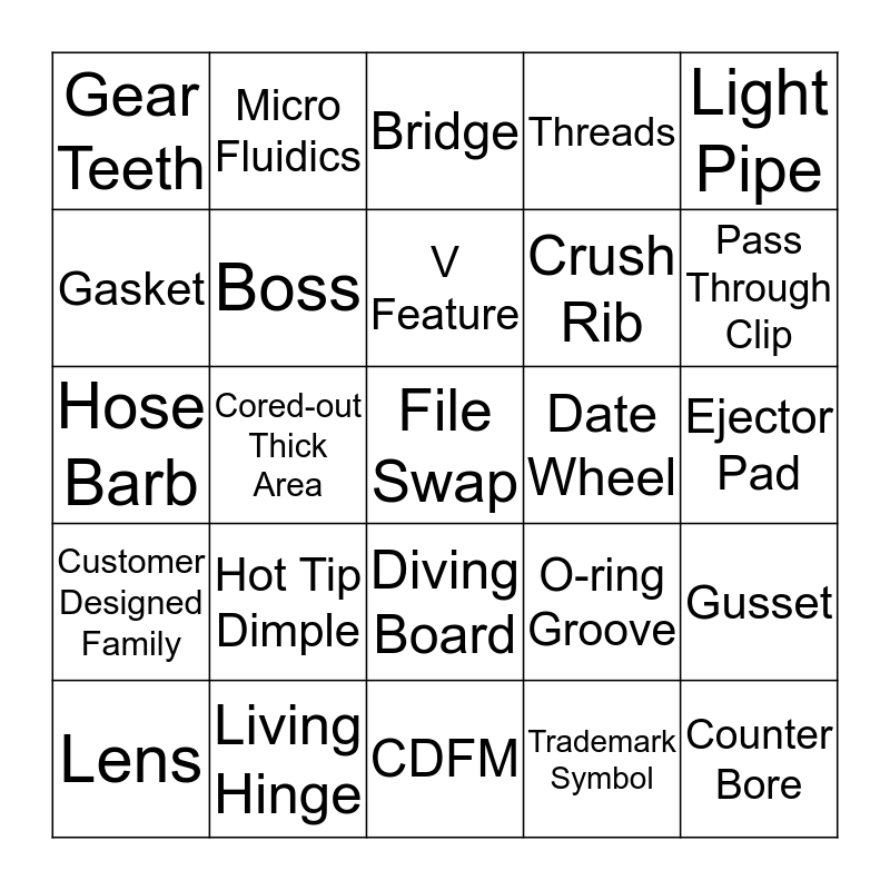This bingo card has a free space and 24 words: Hot Tip Dimple, Living Hinge, V Feature, Lens, Light Pipe, Gear Teeth, Gasket, Micro Fluidics, Date Wheel, Diving Board, Crush Rib, Hose Barb, O-ring Groove, Gusset, Boss, Trademark Symbol, Ejector Pad, Bridge, Pass Through Clip, Cored-out Thick Area, Counter Bore, Customer Designed Family, Threads and CDFM.