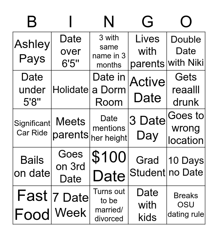 This bingo card has a free space and 24 words: Goes on 3rd Date, 7 Date Week, Date in a Dorm Room, Fast Food, Double Date with Niki, Ashley Pays, Date under 5'8'', Date over 6'5'', 3 Date Day, $100 Date, Active Date, Significant Car Ride, Grad Student, 10 Days no Date, Holidate, Date with kids, Goes to wrong location, 3 with same name in 3 months, Gets reaalll drunk, Meets parents, Breaks OSU dating rule, Bails on date, Lives with parents and Turns out to be married/ divorced.