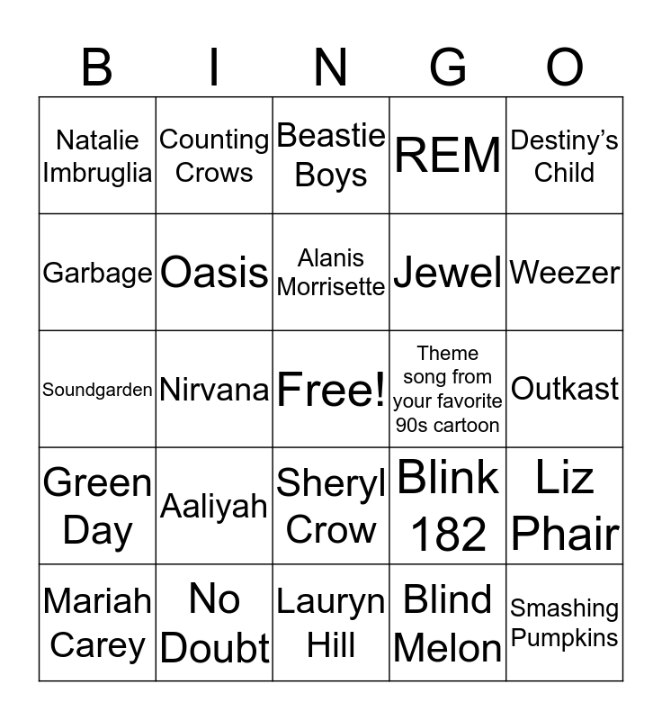 This bingo card has a free space and 36 words: *NSYNC, Backstreet Boys, Britney Spears, Oasis, Blink 182, Green Day, Alanis Morrisette, Christina Aguilara, Destiny’s Child, TLC, Nirvana, REM, Sir Mix-a-Lot, Theme song from your favorite 90s cartoon, Weezer, Natalie Imbruglia, Boyz II Men, Aaliyah, Smashing Pumpkins, Beastie Boys, Outkast, Liz Phair, No Doubt, Mariah Carey, Lauryn Hill, Counting Crows, Soundgarden, Shania Twain, Jewel, Garbage, Spice Girls, Prince, Blind Melon, Sheryl Crow, Busta Rhymes and Barenaked Ladies.