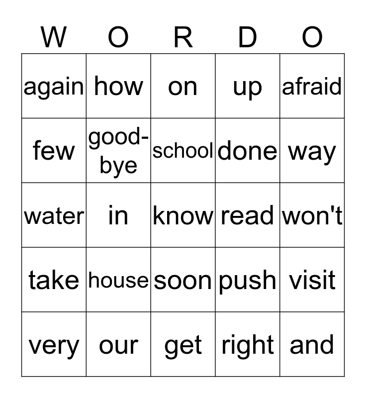 This bingo card has a free space and 24 words: house, our, school, very, afraid, again, few, how, read, soon, done, water, push, visit, good-bye, right, won't, on, way, in, and, take, up and get.