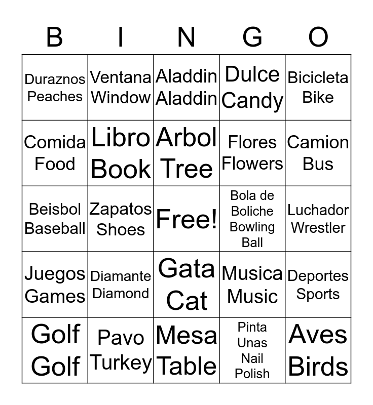 This bingo card has a free space and 50 words: Arroyo Creek, Aves Birds, Cafe Coffee, Mesa Table, Diamante Diamond, Alfombra Rug, Ventana Window, Campar Camping, Comida Food, Juguete Toys, Libro Book, Dulce Candy, Deportes Sports, Musica Music, Television Television, Casa House, Arbol Tree, Bola de Boliche Bowling Ball, Tiburon Shark, Bicicleta Bike, Zapatos Shoes, Pinta Unas Nail Polish, Duraznos Peaches, Flores Flowers, Video Juego Video Game, Japon Japan, Camion Bus, Primo Cousin, Aladdin Aladdin, Gata Cat, Lagartija Lizard, Perro Dog, Pinguino Penguin, Cebra Zebra, Pavo Turkey, Conejo Rabbit, Caminar Walk, Espaguetis Spaghetti, Silla Chair, Luchador Wrestler, Pizza Pizza, Pelicula Movie, Coche de Carreras Race Car, Futbol Football, Golf Golf, Beisbol Baseball, Bailando Dancing, Parque Park, Juegos Games and Cena Dinner.