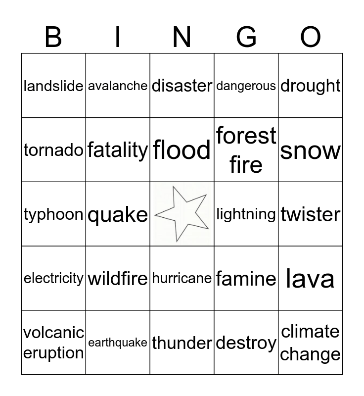 This bingo card has a free space and 24 words: wildfire, earthquake, flood, volcanic eruption, drought, landslide, tornado, avalanche, lightning, hurricane, forest fire, typhoon, famine, lava, fatality, destroy, twister, disaster, snow, quake, climate change, electricity, dangerous and thunder.