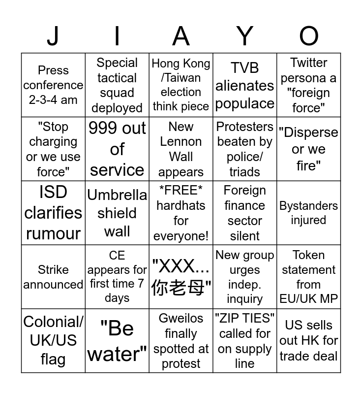 This bingo card has a free space and 24 words: CE appears for first time 7 days, "Be water", New Lennon Wall appears, Colonial/ UK/US flag, Twitter persona a "foreign force", Press conference 2-3-4 am, "Stop charging or we use force", Special tactical squad deployed, Foreign finance sector silent, "XXX... 你老母", Protesters beaten by police/ triads, ISD clarifies rumour, New group urges indep. inquiry, Token statement from EU/UK MP, 999 out of service, "ZIP TIES" called for on supply line, Bystanders injured, Hong Kong /Taiwan election think piece, "Disperse or we fire", Umbrella shield wall, US sells out HK for trade deal, Strike announced, TVB alienates populace and Gweilos finally spotted at protest.