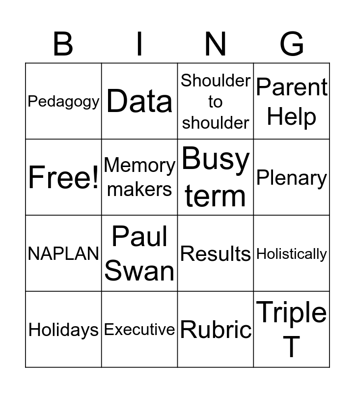 This bingo card has 16 words: Executive, Holistically, Shoulder to shoulder, Pedagogy, NAPLAN, Data, Results, Rubric, Free!, Memory makers, Holidays, Parent Help, Paul Swan, Plenary, Busy term and Triple T.
