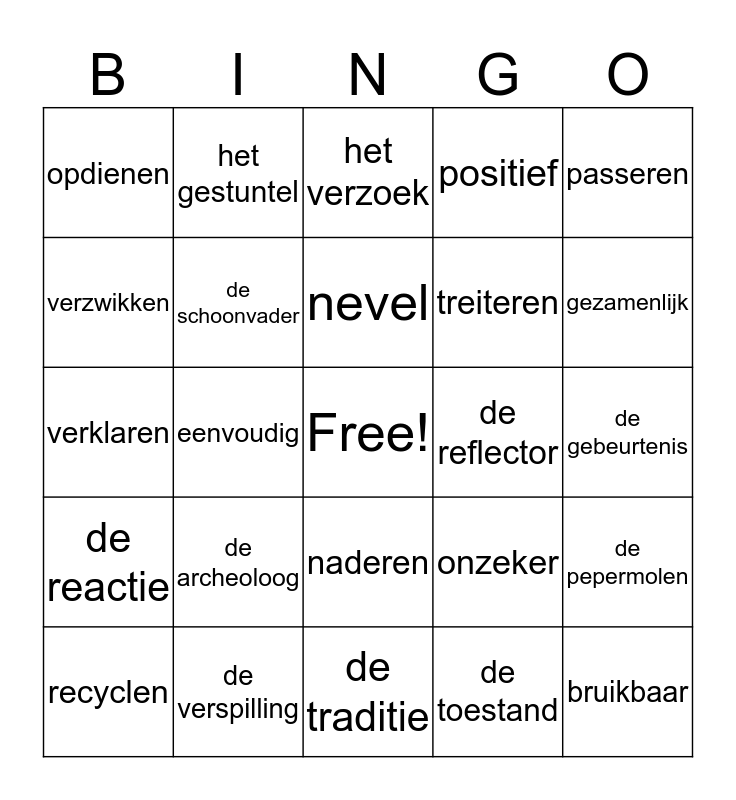 This bingo card has a free space and 24 words: de archeoloog, de verspilling, nevel, recyclen, passeren, opdienen, verzwikken, het gestuntel, de reflector, naderen, treiteren, verklaren, onzeker, de pepermolen, de schoonvader, de toestand, de gebeurtenis, het verzoek, gezamenlijk, eenvoudig, bruikbaar, de reactie, positief and de traditie.