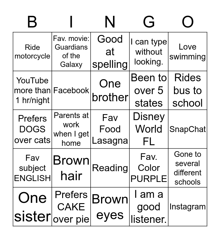 This bingo card has 25 words: Brown hair, Brown eyes, One brother, One sister, Love swimming, Ride motorcycle, YouTube more than 1 hr/night, Fav. movie: Guardians of the Galaxy, Disney World FL, Reading, Been to over 5 states, Prefers DOGS over cats, Fav. Color PURPLE, Gone to several different schools, Facebook, Instagram, SnapChat, Good at spelling, Rides bus to school, Parents at work when I get home, Fav Food Lasagna, Prefers CAKE over pie, Fav subject ENGLISH, I can type without looking. and I am a good listener..