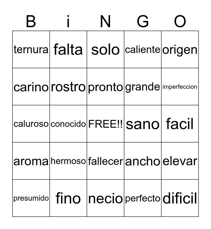 This bingo card has a free space and 24 words: hermoso, fino, pronto, presumido, origen, ternura, carino, falta, sano, fallecer, grande, caluroso, ancho, elevar, rostro, perfecto, facil, solo, imperfeccion, conocido, dificil, aroma, caliente and necio.