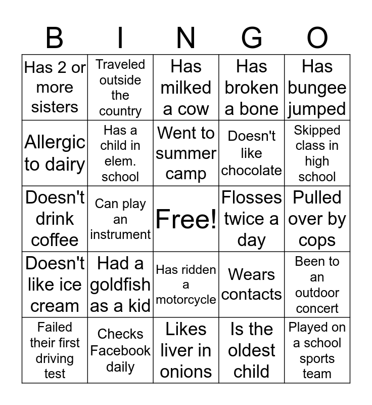 This bingo card has a free space and 24 words: Failed their first driving test, Had a goldfish as a kid, Went to summer camp, Is the oldest child, Has bungee jumped, Has 2 or more sisters, Traveled outside the country, Has milked a cow, Flosses twice a day, Pulled over by cops, Doesn't drink coffee, Has a child in elem. school, Wears contacts, Been to an outdoor concert, Allergic to dairy, Checks Facebook daily, Likes liver in onions, Has broken a bone, Skipped class in high school, Doesn't like ice cream, Can play an instrument, Has ridden a motorcycle, Doesn't like chocolate and Played on a school sports team.