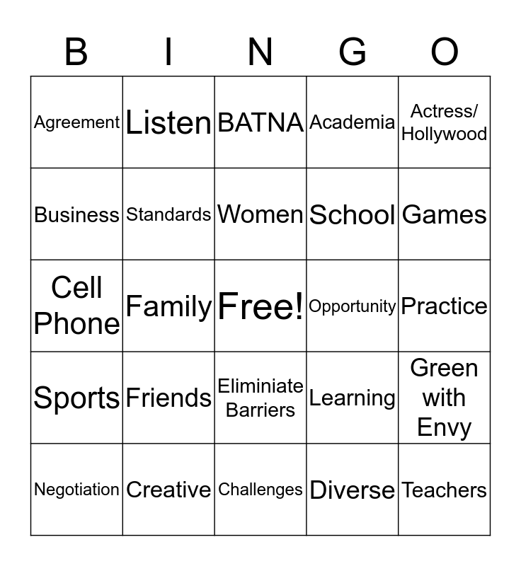 This bingo card has a free space and 39 words: Pay Gap, Trades, Offers, Standards, Negotiation, Eliminiate Barriers, Women, Goals, Actress/ Hollywood, Sports, Family, Academia, Teachers, Practice, Opportunity, Friends, Leadership, Agreement, Women's Soccer Team, Learning, Business, Challenges, School, Games, Speak Up!, Choices, Tools and Skills, Decision Makers, Recognize, Listen, First Offer, Want & Why?, BATNA, Creative, Diverse, Power, Green with Envy, Cell Phone and NO!.