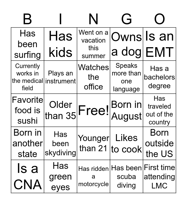 This bingo card has a free space and 24 words: Has been skydiving, Has green eyes, Watches the office, Is a CNA, Is an EMT, Has been surfing, Currently works in the medical field, Has kids, Born in August, Younger than 21, Speaks more than one language, Favorite food is sushi, Likes to cook, Born outside the US, Plays an instrument, Has been scuba diving, Has traveled out of the country, Went on a vacation this summer, Has a bachelors degree, Older than 35, First time attending LMC, Born in another state, Owns a dog and Has ridden a motorcycle.