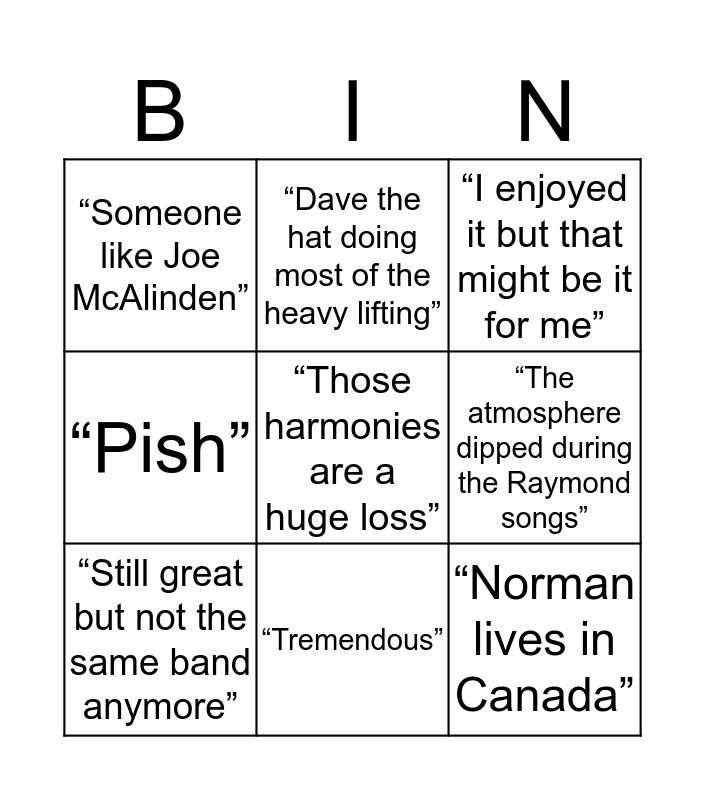 This bingo card has a free space and 8 words: “The atmosphere dipped during the Raymond songs”, “I enjoyed it but that might be it for me”, “Dave the hat doing most of the heavy lifting”, “Still great but not the same band anymore”, “Someone like Joe McAlinden”, “Norman lives in Canada”, “Pish” and “Tremendous”.