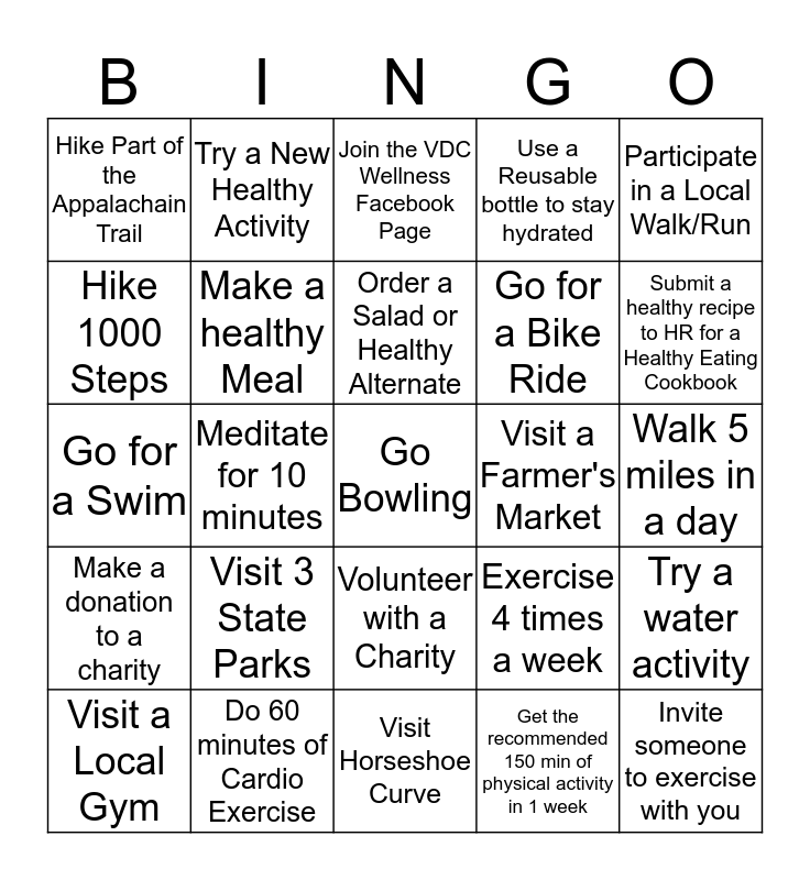 This bingo card has 25 words: Visit 3 State Parks, Visit Horseshoe Curve, Order a Salad or Healthy Alternate, Visit a Local Gym, Participate in a Local Walk/Run, Hike Part of the Appalachain Trail, Hike 1000 Steps, Try a New Healthy Activity, Visit a Farmer's Market, Volunteer with a Charity, Go for a Bike Ride, Go for a Swim, Exercise 4 times a week, Try a water activity, Make a healthy Meal, Invite someone to exercise with you, Walk 5 miles in a day, Join the VDC Wellness Facebook Page, Submit a healthy recipe to HR for a Healthy Eating Cookbook, Meditate for 10 minutes, Go Bowling, Do 60 minutes of Cardio Exercise, Make a donation to a charity, Use a Reusable bottle to stay hydrated and Get the recommended 150 min of physical activity in 1 week.