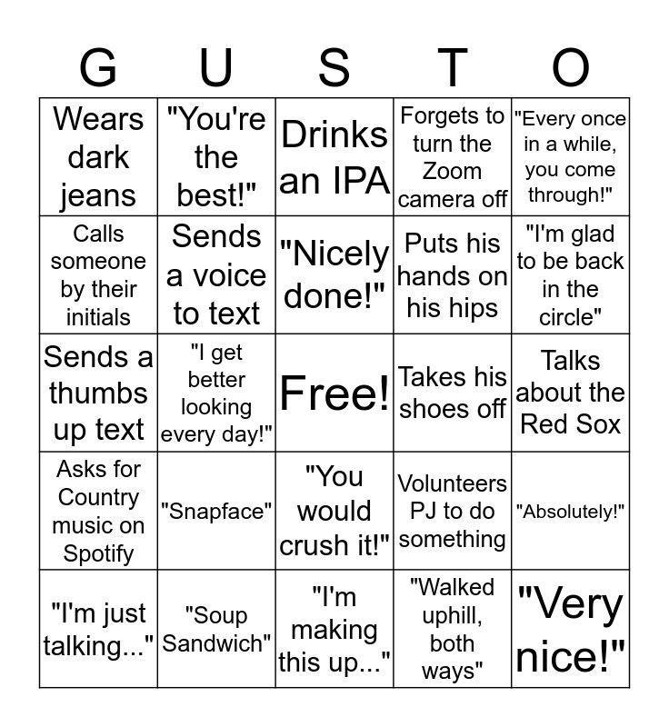 This bingo card has a free space and 29 words: "I'm just talking...", Works standing up, "I get better looking every day!", "Pictogram", Wears dark jeans, Drinks an IPA, Sends a voice to text, "Snapface", Takes his shoes off, "Soup Sandwich", Talks about the Red Sox, "Very nice!", "I'm making this up...", "Walked uphill, both ways", "I'm glad to be back in the circle", "I'm just rambling...", "You would crush it!", Asks for Country music on Spotify, "Every once in a while, you come through!", Sends a thumbs up text, Volunteers PJ to do something, "What's up, Team?", Puts his hands on his hips, Calls someone by their initials, Forgets to turn the Zoom camera off, "You're the best!", "Absolutely!", "Nicely done!" and "Very interesting...".