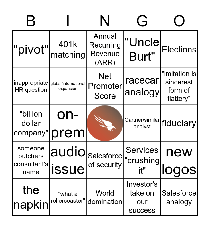 This bingo card has a free space and 46 words: Frictionless, Salesforce analogy, Hockey Stick ("Up and to the right"), World domination, audio issue, video issue, 401k matching, Falcon Fit, inappropriate HR question, employee headcount, global/international expansion, "Uncle Burt", new logos, Services "crushing it", Triple Unicorn, Video of exec on news, Net Promoter Score, Gartner/similar analyst, Fal.Con, Elections, on-prem, Investor's take on our success, "pivot", racecar analogy, CrowdStrike Champion, "imitation is sincerest form of flattery", the napkin, 5-year anniversary count > 3, Salesforce of security, someone butchers consultant's name, no one raises their hand in the room, a hot mic, "layer cake", "I love this slide", George is employee #12, "what a rollercoaster", fiduciary, Generally Accepted Accounting Principles (GAAP), earnings call, "reduce expenses", profitability, Annual Recurring Revenue (ARR), "billion dollar company", company is "once in a lifetime", processed # events over hr/day/wk and "consumer market".