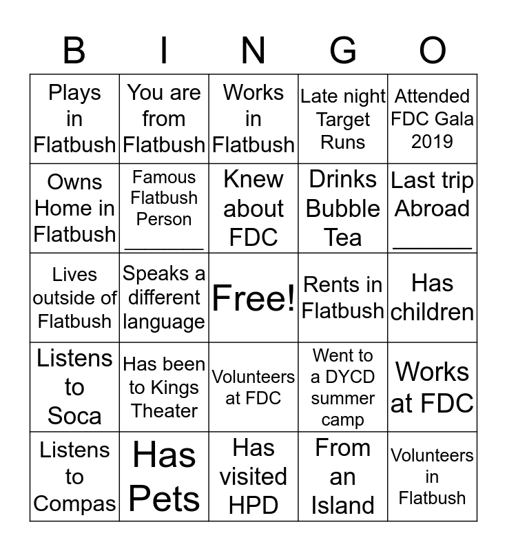 This bingo card has a free space and 24 words: Has been to Kings Theater, Has Pets, Knew about FDC, Listens to Compas, Attended FDC Gala 2019, Plays in Flatbush, Owns Home in Flatbush, You are from Flatbush, Rents in Flatbush, Volunteers at FDC, Drinks Bubble Tea, Lives outside of Flatbush, Went to a DYCD summer camp, Works at FDC, Famous Flatbush Person ________, From an Island, Has children, Works in Flatbush, Last trip Abroad ______, Speaks a different language, Volunteers in Flatbush, Listens to Soca, Late night Target Runs and Has visited HPD.