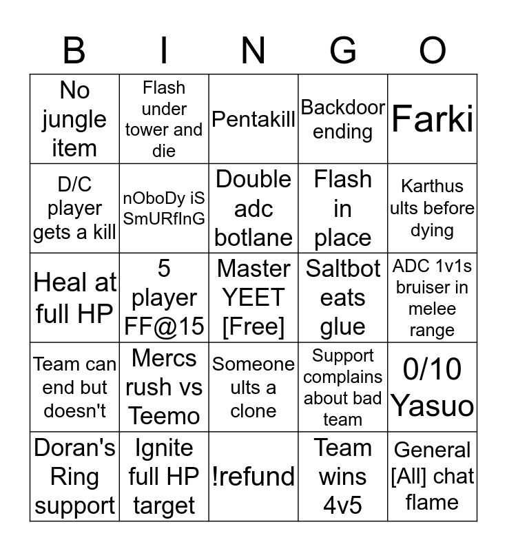 This bingo card has a free space and 24 words: Mercs rush vs Teemo, Ignite full HP target, Double adc botlane, Doran's Ring support, Farki, No jungle item, D/C player gets a kill, Flash under tower and die, Saltbot eats glue, Someone ults a clone, Flash in place, Heal at full HP, Support complains about bad team, 0/10 Yasuo, nOboDy iS SmURfInG, Team wins 4v5, ADC 1v1s bruiser in melee range, Pentakill, Karthus ults before dying, 5 player FF@15, General [All] chat flame, Team can end but doesn't, Backdoor ending and !refund.