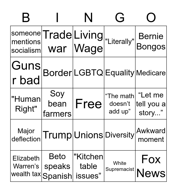 This bingo card has a free space and 38 words: I.C.E., YANG GANG, "Fair Share", Border, Awkward moment, Trump, LGBTQ, A man interrupts a woman, Bernie Bongos, Equality, Soy bean farmers, "Literally", Fox News, “Let me tell you a story...”, Guns r bad, Major deflection, Green New Deal, Living Wage, Someone mentions Hillary Clinton, “The math doesn’t add up”, someone mentions socialism, Beto speaks Spanish, Medicare, Elizabeth Warren’s wealth tax, The Private Sector, "Kitchen table issues”, DACA, Student debt, Racism, Russia, The Wall, Unions, White Supremacist, Trade war, Free Healthcare, Diversity, "Human Right" and “A woman’s right to choose”.