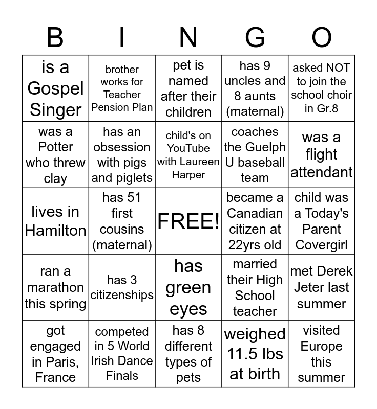 This bingo card has a free space and 24 words: has 3 citizenships, competed in 5 World Irish Dance Finals, child's on YouTube with Laureen Harper, got engaged in Paris, France, asked NOT to join the school choir in Gr.8, is a Gospel Singer, was a Potter who threw clay, brother works for Teacher Pension Plan, became a Canadian citizen at 22yrs old, has green eyes, coaches the Guelph U baseball team, lives in Hamilton, married their High School teacher, met Derek Jeter last summer, has an obsession with pigs and piglets, weighed 11.5 lbs at birth, child was a Today's Parent Covergirl, pet is named after their children, was a flight attendant, has 51 first cousins (maternal), visited Europe this summer, ran a marathon this spring, has 9 uncles and 8 aunts (maternal) and has 8 different types of pets.