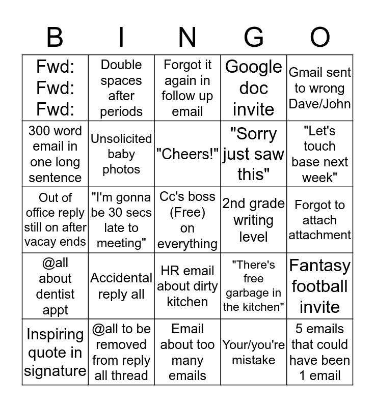 This bingo card has a free space and 24 words: Accidental reply all, @all to be removed from reply all thread, "Cheers!", Inspiring quote in signature, Gmail sent to wrong Dave/John, Fwd: Fwd: Fwd:, 300 word email in one long sentence, Double spaces after periods, 2nd grade writing level, HR email about dirty kitchen, "Sorry just saw this", Out of office reply still on after vacay ends, "There's free garbage in the kitchen", Fantasy football invite, Unsolicited baby photos, Your/you're mistake, Forgot to attach attachment, Forgot it again in follow up email, "Let's touch base next week", "I'm gonna be 30 secs late to meeting", 5 emails that could have been 1 email, @all about dentist appt, Google doc invite and Email about too many emails.