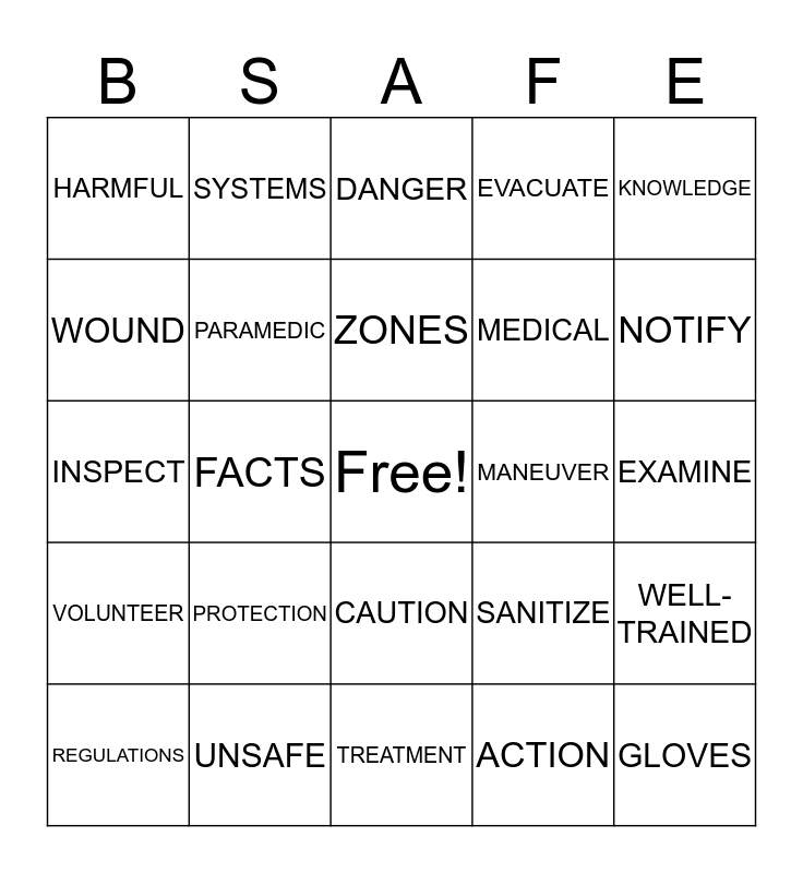 This bingo card has a free space and 75 words: ACCIDENT, AWARENESS, DANGER, EMERGENCY, INVESTIGATE, LEADER, ENFORCE, OBJECTIVE, REACTIONS, QUESTION, PREVENT, FIRST AID, ZONES, WOUND, CARELESS, FACTS, FORKLIFT, GLOVES, FATIGUE, KNOWLEDGE, INSTRUCT, INSPECT, PARAMEDIC, SYSTEMS, EVACUATE, TRAINING, TECHNIQUE, FOLLOW-UP, PANIC, REPORT, SITUATION, RESPONSE, SECURITY, SANITIZE, NOTIFY, MEDICAL, INTENSE, INFORMATIVE, EXAMINE, ACTION, ASSESSING, BIOHAZARD, DEMONSTRATE, CROWD CONTROL, CPR, LOCATION, REGULATIONS, HARMFUL, IMPACT, EXTINGUISH, ALERT, CAUTION, CALL 911, COMPRESSION, HELP, INCIDENT, MOTIVATION, PROGRAM, FIRE DRILL, SPRINKLER, PROTECTION, PARTICIPATE, HAZARD, INJURY, PRECAUTIONS, MANEUVER, LOCK-OUT, FOCUS, EXIT, WELL-TRAINED, VOLUNTEER, UNSAFE, WITNESS, TREATMENT and EXPOSURE.