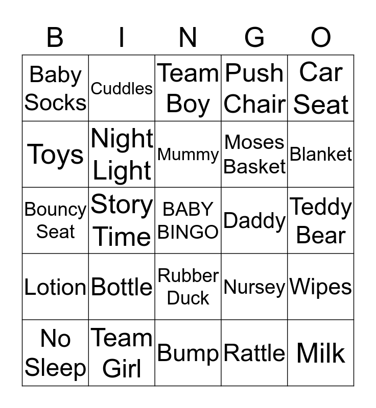 This bingo card has a free space and 29 words: Baby Oil, Team Girl, Team Boy, Nappy, Car Seat, Baby Socks, Night Light, Mummy, Daddy, Wipes, No Sleep, Story Time, Rattle, Milk, Bouncy Seat, Baby on Board, Bump, Nursey, Blanket, Lotion, Bottle, Baby Food, Moses Basket, Teddy Bear, Toys, Cuddles, Rubber Duck, Push Chair and Bib.