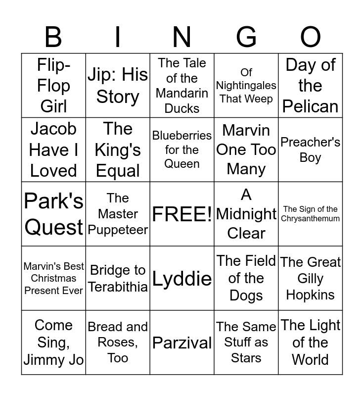 This bingo card has a free space and 24 words: Bridge to Terabithia, Bread and Roses, Too, Blueberries for the Queen, Come Sing, Jimmy Jo, Day of the Pelican, Flip-Flop Girl, Jacob Have I Loved, Jip: His Story, A Midnight Clear, Lyddie, Marvin One Too Many, Park's Quest, The Field of the Dogs, The Great Gilly Hopkins, The King's Equal, The Same Stuff as Stars, The Sign of the Chrysanthemum, The Tale of the Mandarin Ducks, Preacher's Boy, The Master Puppeteer, The Light of the World, Marvin's Best Christmas Present Ever, Of Nightingales That Weep and Parzival.