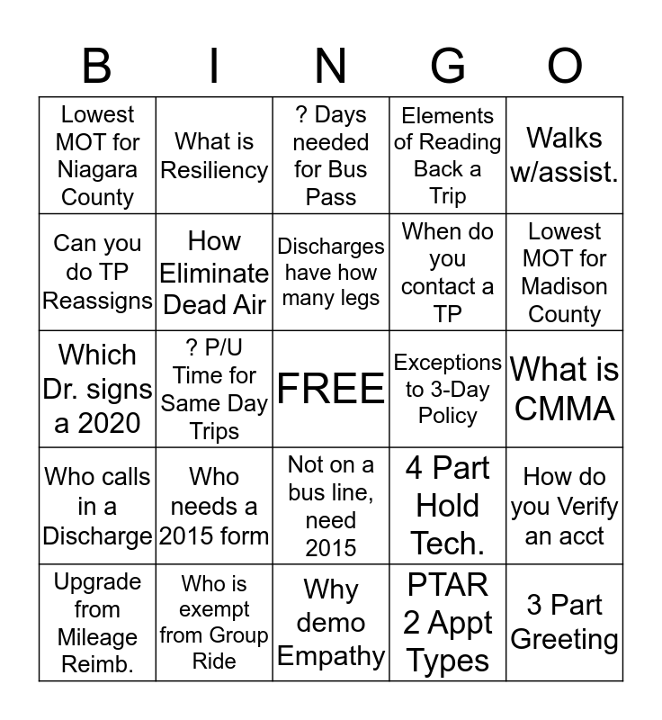 This bingo card has a free space and 24 words: Who needs a 2015 form, Who is exempt from Group Ride, Discharges have how many legs, Upgrade from Mileage Reimb., Walks w/assist., Lowest MOT for Niagara County, Can you do TP Reassigns, What is Resiliency, Exceptions to 3-Day Policy, Not on a bus line, need 2015, When do you contact a TP, Which Dr. signs a 2020, 4 Part Hold Tech., How do you Verify an acct, How Eliminate Dead Air, PTAR 2 Appt Types, What is CMMA, ? Days needed for Bus Pass, Lowest MOT for Madison County, ? P/U Time for Same Day Trips, 3 Part Greeting, Who calls in a Discharge, Elements of Reading Back a Trip and Why demo Empathy.