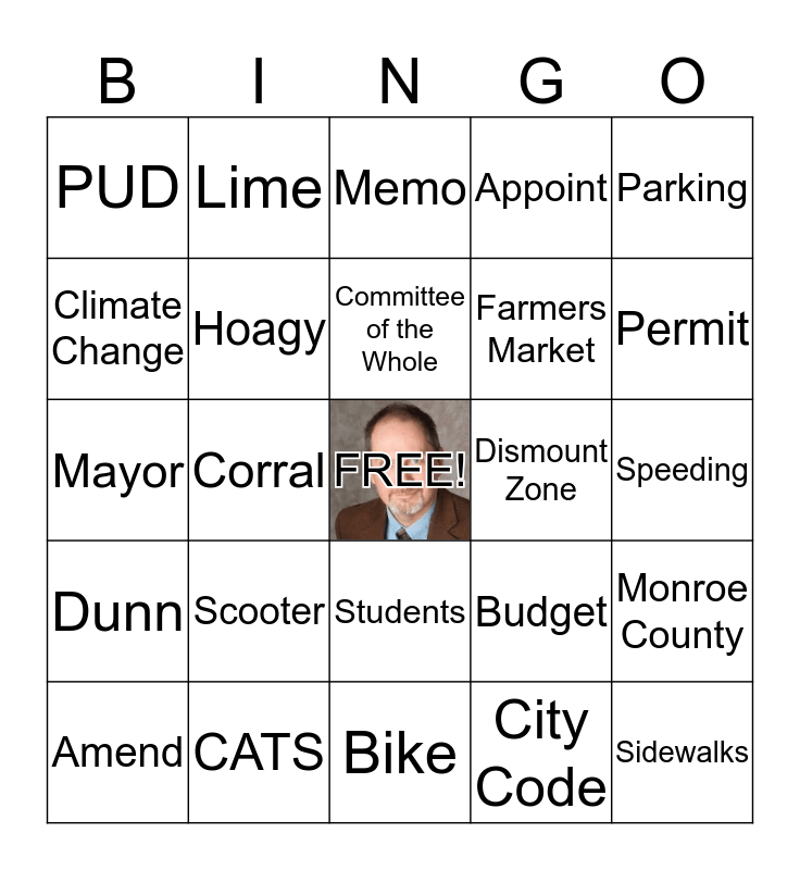 This bingo card has a free space and 24 words: Scooter, CATS, Committee of the Whole, Amend, Parking, PUD, Climate Change, Lime, Dismount Zone, Students, Farmers Market, Mayor, Budget, Monroe County, Hoagy, City Code, Speeding, Memo, Permit, Corral, Sidewalks, Dunn, Appoint and Bike.