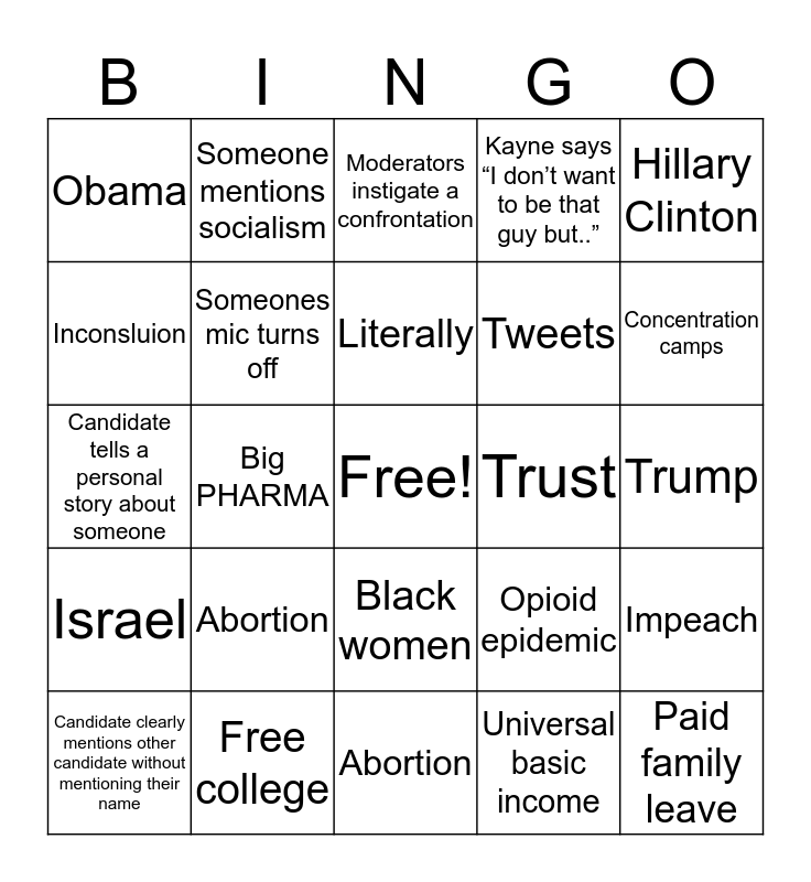 This bingo card has a free space and 74 words: Putin, Russia, Moderators instigate a confrontation, Ugly, Hate, Foreign, Planned parenthood, Candidate is told to stop talking more than 3 times, Candidate clearly mentions other candidate without mentioning their name, Biden mentions obama, Someone “tssk” in disgust, Granny asks if anyone needs a snack, Literally, Inconsluion, Corporations, Big PHARMA, Someone plugs their campaign website, Concentration camps, Talks about parents or grandparents, Candidate tells a personal story about someone, Someones mic turns off, Someone mentions socialism, Kayne says “I don’t want to be that guy but..”, Cut off by a moderator, Paid family leave, Immigration reform, Green New Deal, Voting rights, Student debt forgiveness, Socialism, Hillary Clinton, Wikileaks, Mueller, Medicare for all, Marijuana legalization, Universal basic income, Insulin, Obama, Reparations, Electoral college, Abortion, Free college, Climate change, Revolution, LGBTQ, Obama, Racism, Abortion, “I have a plan for that”, Criminal justice, Working class voter, Supreme court, Trump, Iran, Voter suppression, Babies in cages, Black women, Healthcare for all, Threat, Impeach, Tweets, Open Borders, Israel, Unfit, Trust, Stupid, Economy, AOC (alexandria ocasio-cortez) is mentioned, Opioid epidemic, References someone from the other debate, Trickle down economics, Someone wears a tie that isn’t red or blue, Moderators bring up someone’s age and Billionaires.