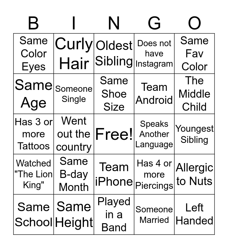 This bingo card has a free space and 24 words: Same B-day Month, Same Height, Same Shoe Size, Same School, Same Fav Color, Same Color Eyes, Same Age, Curly Hair, Speaks Another Language, Team iPhone, Team Android, Has 3 or more Tattoos, Has 4 or more Piercings, Allergic to Nuts, Someone Single, Someone Married, Youngest Sibling, Oldest Sibling, The Middle Child, Went out the country, Left Handed, Watched "The Lion King", Does not have Instagram and Played in a Band.