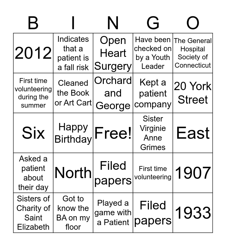 This bingo card has a free space and 59 words: Transported a patient in a wheelchair, Got to know the BA on my floor, Prepared a patient’s food tray, Asked a patient about their day, Filed papers, Played a game with a Patient, Cleaned the Book or Art Cart, Restocked items or supplies, Kept a patient company, Taken the shuttle, Have been checked on by a Youth Leader, First time volunteering, First time volunteering during the summer, Forgot my badge, East-South-West-North, 2012, 1933, The General Hospital Society of Connecticut, 1450 Chapel Street, Orchard and George, Sister Virginie Anne Grimes, Open Heart Surgery, Sisters of Charity of Saint Elizabeth, 1907, West/Children's Hospital, 14, North Pavilion, 7th Floor, North - Radiation Oncology, 20 York Street, South Pavilion, Pull - Aim - Squeeze - Sweep, Rescue - Alarm - Confine - Extinguish, Health Information Portability and Accountability Act, 155, Indicates that a patient is a fall risk, Wash in or sanitize hands, Red, Happy Birthday, Where are the bathrooms?, Six, Betty Panza, North, East, George, Transported a patient in a wheelchair, Got to know the BA on my floor, Prepared a patient’s food tray, Asked a patient about their day, Filed papers, Played a game with a Patient, Cleaned the Book or Art Cart, Restocked items or supplies, Kept a patient company, Taken the shuttle, Have been checked on by a Youth Leader, First time volunteering, First time volunteering during the summer, Forgot my badge and Baking and the British Royal Family.