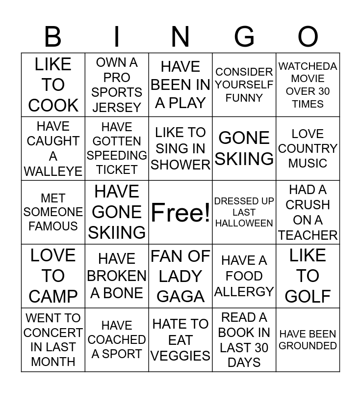 This bingo card has a free space and 24 words: HAVE BROKEN A BONE, HAVE COACHED A SPORT, LIKE TO SING IN SHOWER, WENT TO CONCERT IN LAST MONTH, WATCHEDA MOVIE OVER 30 TIMES, LIKE TO COOK, HAVE CAUGHT A WALLEYE, OWN A PRO SPORTS JERSEY, DRESSED UP LAST HALLOWEEN, FAN OF LADY GAGA, GONE SKIING, MET SOMEONE FAMOUS, HAVE A FOOD ALLERGY, LIKE TO GOLF, HAVE GOTTEN SPEEDING TICKET, READ A BOOK IN LAST 30 DAYS, HAD A CRUSH ON A TEACHER, HAVE BEEN IN A PLAY, LOVE COUNTRY MUSIC, HAVE GONE SKIING, HAVE BEEN GROUNDED, LOVE TO CAMP, CONSIDER YOURSELF FUNNY and HATE TO EAT VEGGIES.