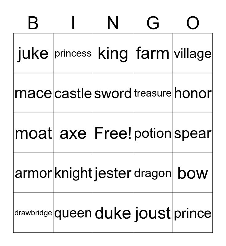 This bingo card has a free space and 24 words: knight, queen, sword, drawbridge, village, juke, mace, princess, potion, jester, treasure, moat, dragon, bow, castle, joust, spear, king, honor, axe, prince, armor, farm and duke.
