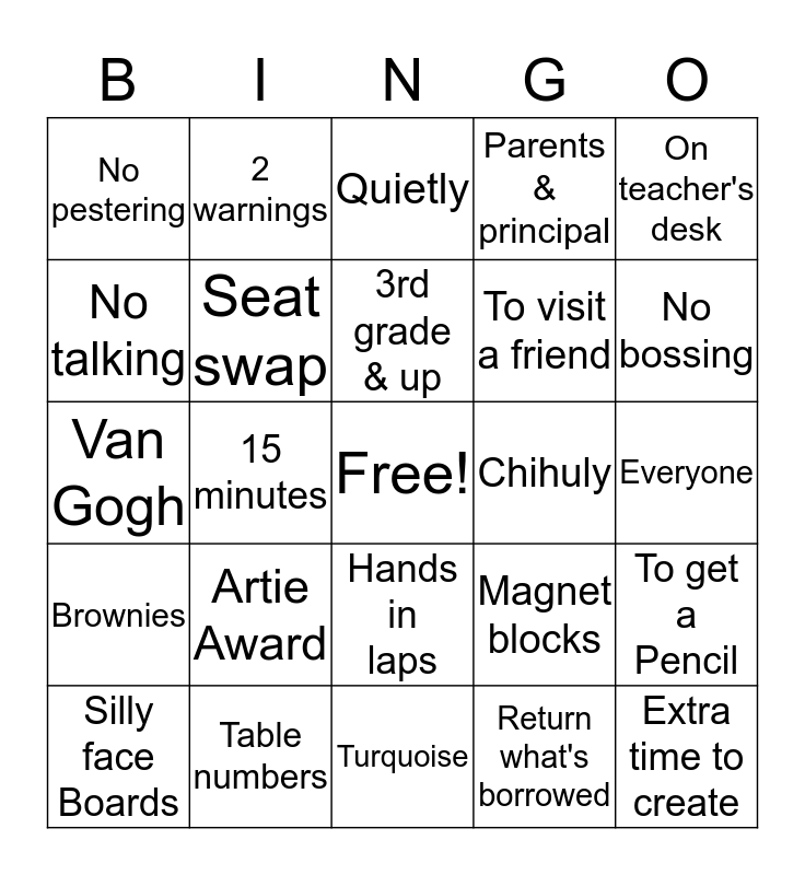 This bingo card has a free space and 42 words: Frosty, 3rd grade & up, Raise your hand, Artie Award, Return what's borrowed, To get a Pencil, Extra time to create, 5 breaths, Quietly, Hands in laps, Everyone, No bossing, 15 minutes, On teacher's desk, Hushed, soft voice, Magnet blocks, Attentive, Van Gogh, 1 warning, 2 warnings, No talking, Ice Cream, Grades 4, 5, & 6, No pestering, Binx, Golden Paintbrush Award, To visit a friend, Normal voice, Warhol, 1 piece, No art project, Brownies, Seat swap, Turquoise, Architect boards, Silly face Boards, Table numbers, Chihuly, To get a Kleenex, To get an eraser, Parents & principal and Eraser parking lot.