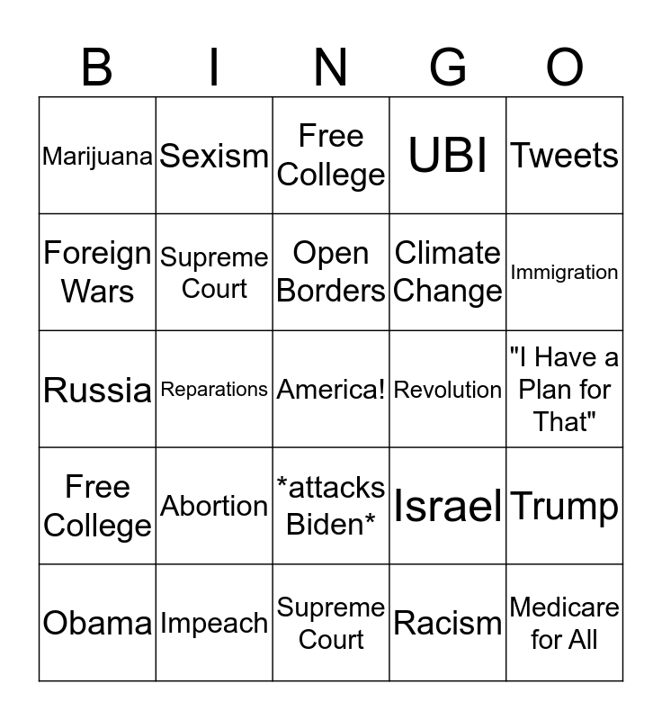 This bingo card has a free space and 29 words: Obama, Green New Deal, Reparations, Socialism, Marijuana, Free College, Supreme Court, Abortion, Revolution, Impeach, "I Have a Plan for That", Medicare for All, Supreme Court, Racism, Immigration, Working Class Voter, *attacks Biden*, Free College, Tweets, Russia, Israel, Revolution, Climate Change, Foreign Wars, UBI, Sexism, Trump, Open Borders and LGBTQ.