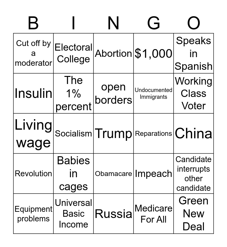 This bingo card has a free space and 30 words: Universal Basic Income, Obama, Socialism, Assault-style rifle, Cut off by a moderator, Abortion, The 1% percent, Obamacare, Reparations, Russia, China, Green New Deal, Medicare For All, Free College, Working Class Voter, Mentioning their parents, Impeach, Revolution, Babies in cages, Speaks in Spanish, Living wage, Depressing personal anecdotes, Electoral College, Undocumented Immigrants, Insulin, $1,000, Candidate interrupts other candidate, Equipment problems, open borders and Racism.