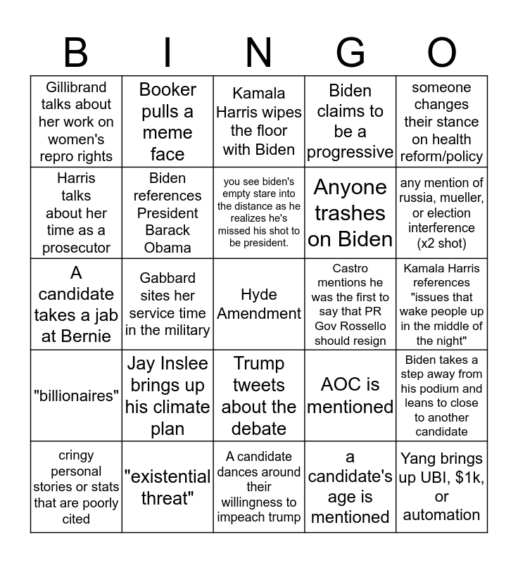 This bingo card has 30 words: "existential threat", De Blasio mentions he's the mayor of the safest big city, Gabbard sites her service time in the military, Someone defends "The Squad", Gillibrand talks about her work on women's repro rights, Kamala Harris wipes the floor with Biden, Biden references President Barack Obama, Trump tweets about the debate, Castro mentions he was the first to say that PR Gov Rossello should resign, A candidate dances around their willingness to impeach trump, Kamala Harris references "issues that wake people up in the middle of the night", Hyde Amendment, a candidate's age is mentioned, Yang brings up UBI, $1k, or automation, any mention of russia, mueller, or election interference (x2 shot), 1 shot if it looks like a mic is turned off. 2 shots if it's Andrew Yang's mic, AOC is mentioned, "billionaires", Jay Inslee brings up his climate plan, someone changes their stance on health reform/policy, A candidate takes a jab at Bernie, "socialism", Booker pulls a meme face, Anyone trashes on Biden, Harris talks about her time as a prosecutor, Biden claims to be a progressive, Biden takes a step away from his podium and leans to close to another candidate, cringy personal stories or stats that are poorly cited, you see biden's empty stare into the distance as he realizes he's missed his shot to be president. and camera pans to Castro's twin brother.