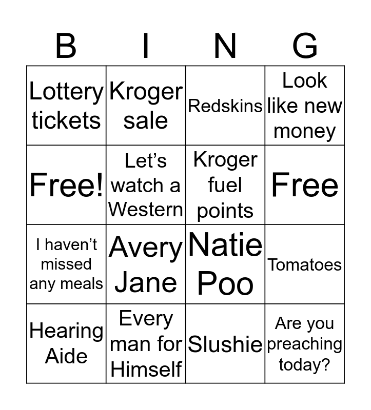 This bingo card has 16 words: Every man for Himself, Tomatoes, Redskins, Lottery tickets, I haven’t missed any meals, Kroger sale, Natie Poo, Slushie, Free!, Let’s watch a Western, Hearing Aide, Look like new money, Avery Jane, Free, Kroger fuel points and Are you preaching today?.