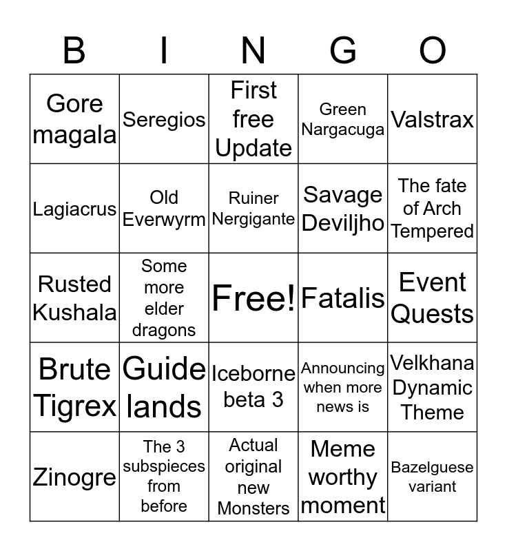 This bingo card has a free space and 24 words: Guide lands, The 3 subspieces from before, Ruiner Nergigante, Zinogre, Valstrax, Gore magala, Lagiacrus, Seregios, Fatalis, Iceborne beta 3, Savage Deviljho, Rusted Kushala, Announcing when more news is, Velkhana Dynamic Theme, Old Everwyrm, Meme worthy moment, Event Quests, First free Update, The fate of Arch Tempered, Some more elder dragons, Bazelguese variant, Brute Tigrex, Green Nargacuga and Actual original new Monsters.