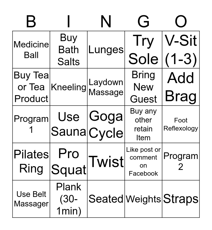This bingo card has a free space and 26 words: Twist, Weights, Laydown Massage, Plank (30-1min), V-Sit (1-3), Medicine Ball, Buy Tea or Tea Product, Buy Bath Salts, Foot Reflexology, Like post or comment on Facebook, Bring New Guest, Program 1, Program 2, Use Belt Massager, Use Sauna, Use Portable Sauna, Try Sole, Pilates Ring, Lunges, Straps, Add Brag, Seated, Buy any other retain Item, Pro Squat, Kneeling and Sitting toe Hold.