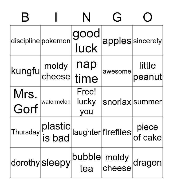 This bingo card has a free space and 29 words: dorothy, sea turtles, watermelon, lemonade, discipline, good luck, moldy cheese, plastic is bad, snorlax, sleepy, summer, dragon, bubble tea, moldy cheese, little peanut, dead rat, laughter, Thursday, sincerely, Mrs. Gorf, fireflies, ocean, awesome, kungfu, apples, pokemon, piece of cake, nap time and winner?.