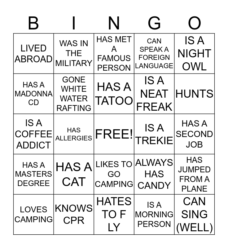 This bingo card has a free space and 24 words: HAS A CAT, KNOWS CPR, HAS A TATOO, LOVES CAMPING, IS A NIGHT OWL, LIVED ABROAD, HAS A MADONNA CD, WAS IN THE MILITARY, IS A TREKIE, LIKES TO GO CAMPING, IS A NEAT FREAK, IS A COFFEE ADDICT, ALWAYS HAS CANDY, HAS JUMPED FROM A PLANE, GONE WHITE WATER RAFTING, IS A MORNING PERSON, HAS A SECOND JOB, HAS MET A FAMOUS PERSON, HUNTS, HAS ALLERGIES, CAN SING (WELL), HAS A MASTERS DEGREE, CAN SPEAK A FOREIGN LANGUAGE and HATES TO FLY.