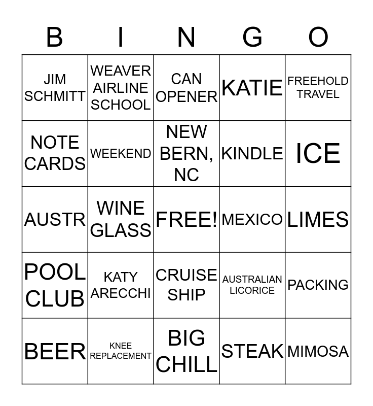 This bingo card has a free space and 24 words: KATY ARECCHI, KNEE REPLACEMENT, NEW BERN, NC, BEER, FREEHOLD TRAVEL, JIM SCHMITT, NOTE CARDS, WEAVER AIRLINE SCHOOL, MEXICO, CRUISE SHIP, KINDLE, AUSTR, AUSTRALIAN LICORICE, PACKING, WEEKEND, STEAK, LIMES, CAN OPENER, ICE, WINE GLASS, MIMOSA, POOL CLUB, KATIE and BIG CHILL.