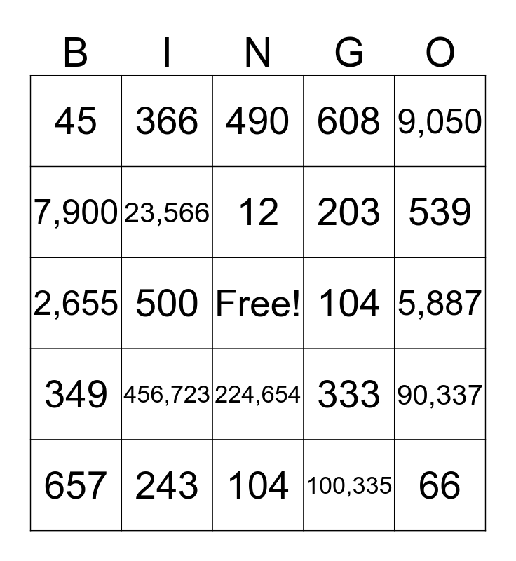 This bingo card has a free space and 24 words: 456,723, 243, 12, 657, 9,050, 45, 7,900, 366, 104, 224,654, 203, 2,655, 333, 90,337, 23,566, 100,335, 5,887, 490, 539, 500, 66, 349, 608 and 104.
