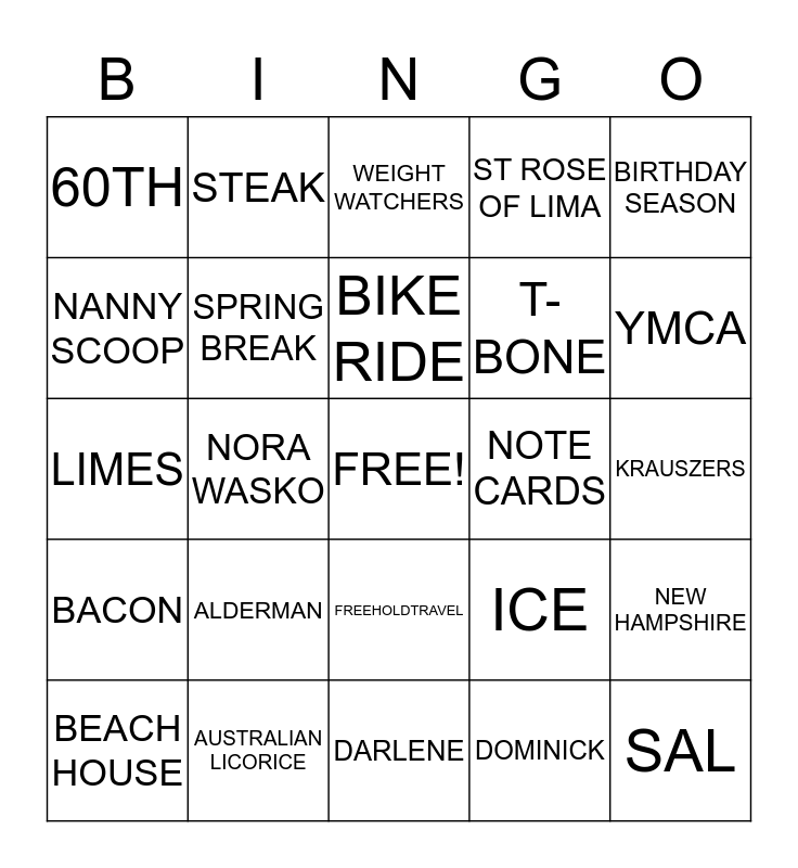 This bingo card has a free space and 24 words: ALDERMAN, AUSTRALIAN LICORICE, BIKE RIDE, BEACH HOUSE, BIRTHDAY SEASON, 60TH, NANNY SCOOP, STEAK, NOTE CARDS, FREEHOLDTRAVEL, T- BONE, LIMES, ICE, NEW HAMPSHIRE, SPRING BREAK, DOMINICK, KRAUSZERS, WEIGHT WATCHERS, YMCA, NORA WASKO, SAL, BACON, ST ROSE OF LIMA and DARLENE.