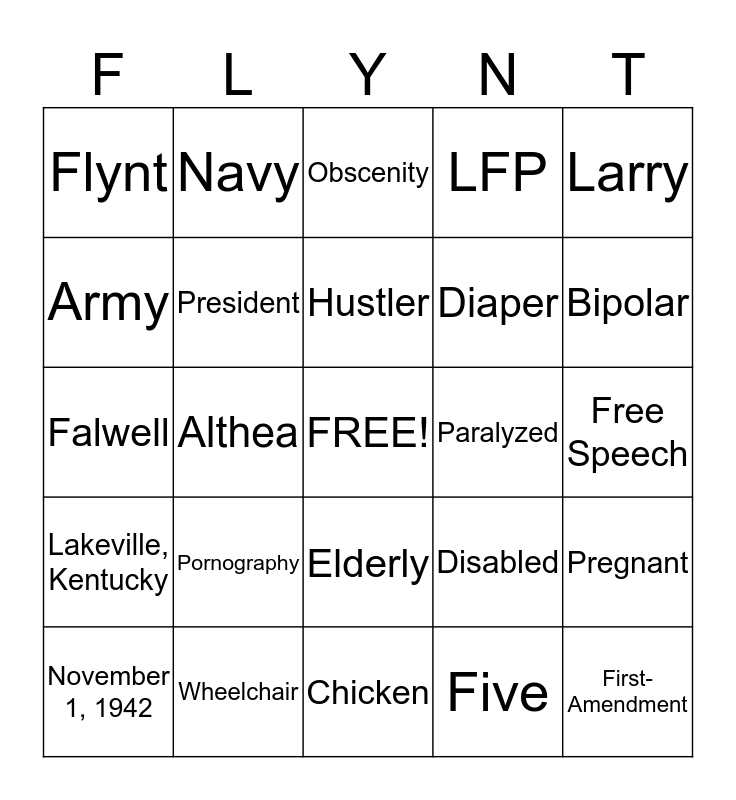 This bingo card has a free space and 24 words: Pornography, Wheelchair, Hustler, November 1, 1942, Larry, Flynt, Army, Navy, Paralyzed, Elderly, Diaper, Falwell, Disabled, Pregnant, President, Five, Free Speech, Obscenity, Bipolar, Althea, First-Amendment, Lakeville, Kentucky, LFP and Chicken.