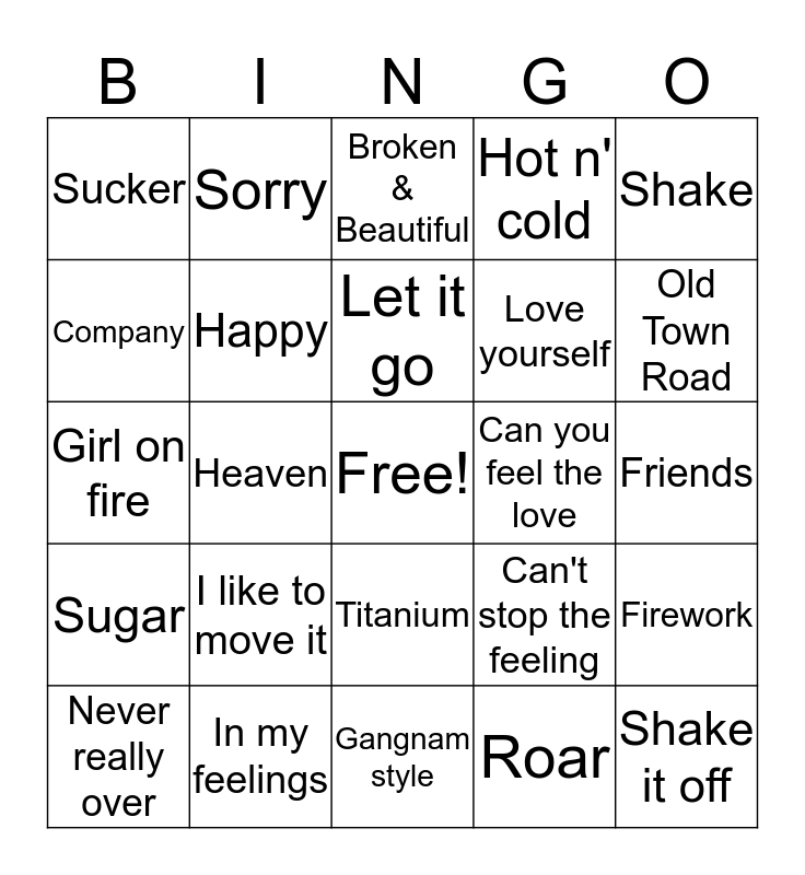 This bingo card has a free space and 29 words: Never really over, Sunflower, Heaven, Here with me, Sucker, Broken & Beautiful, Happy, I like to move it, Can you feel the love, In my feelings, Friends, Shake it off, Gangnam style, Roar, Old Town Road, Barbie Girl, Titanium, Sugar, Shake, Girl on fire, Can't stop the feeling, Summer, Love yourself, Company, Hot n' cold, Sorry, Firework, Let it go and Lava.